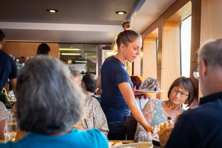 Sull’ampio ponte con tavoli e sedie puoi goderti la navigazione, cenare all’aperto e trascorrere momenti di relax con i tuoi nuovi compagni di viaggio.