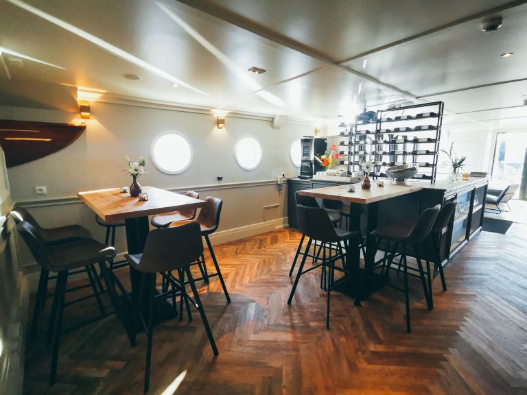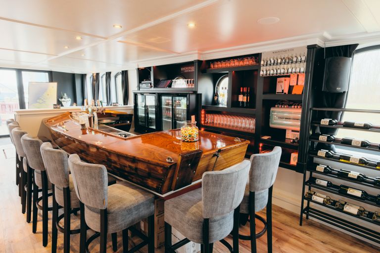 Sul ponte superiore trovano posto un’area lounge con ampie finestre panoramiche e un accogliente bar dove bere qualcosa ammirando il paesaggio. Inoltre vi sono anche due schermi per vedere la posizione della barca in tempo reale.