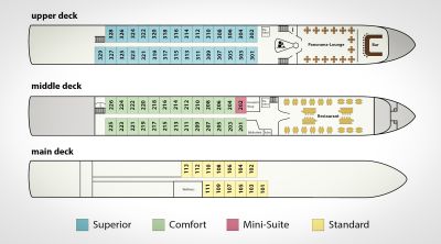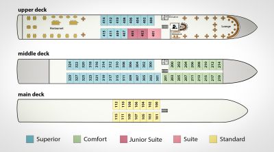 Le cabine Superior possono trovarsi sia sul ponte centrale, sia sul ponte superiore. Il prezzo non cambia.