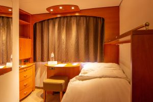 Le cabine doppie sono grandi 11/12 mq, le singole 9 mq. Tutte le cabine sono dotate di servizi privati, phon, telefono, TV, aria condizionata, frigorifero, cassaforte e finestre panoramiche. Le finestre sul ponte superiore sono apribili.
