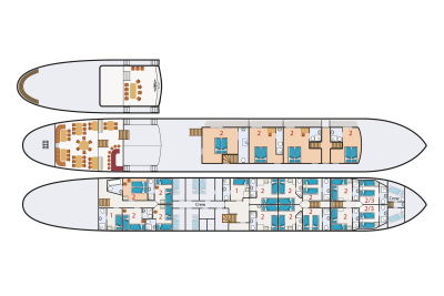 Sotto ponte si trovano la sala ristorante e l’area relax e sul ponte ci sono un bar e una vasca idromassaggio esterna per rilassarsi a fine giornata. Vedi la barca in dettaglio